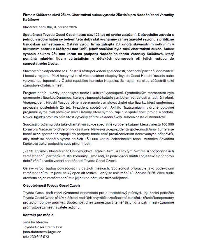 Naše společnost Toyoda Gosei Czech letos slaví 25 let od svého založení v Klášterci nad Ohří. Oslavy odstartovalo slavnostní setkání 28. února 2026, jehož součástí byla také charitativní aukce na podporu Nadační fond Veroniky Kašákové. Díky aukci a dobrovolným příspěvkům hostů se podařilo vybrat celkem 250 000 korun, které pomohou mladým lidem z dětských domovů při vstupu do samostatného života. Slavnostní odpoledne se neslo v duchu japonských tradic i symboliky – nechyběla ani ceremonie s figurkou Daruma, která vyjadřuje vytrvalost a nové cíle do budoucna. „Za 25 let jsme vybudovali stabilní firmu a silný tým. Vážíme si podpory zaměstnanců, partnerů i regionu a jsme rádi, že jsme výročí mohli spojit s podporou dobré věci,“ uvedlo vedení společnosti. Oslavy budou pokračovat také v dalších měsících. Vrcholem bude open air festival pro zaměstnance i veřejnost, který se uskuteční 13. června 2026.