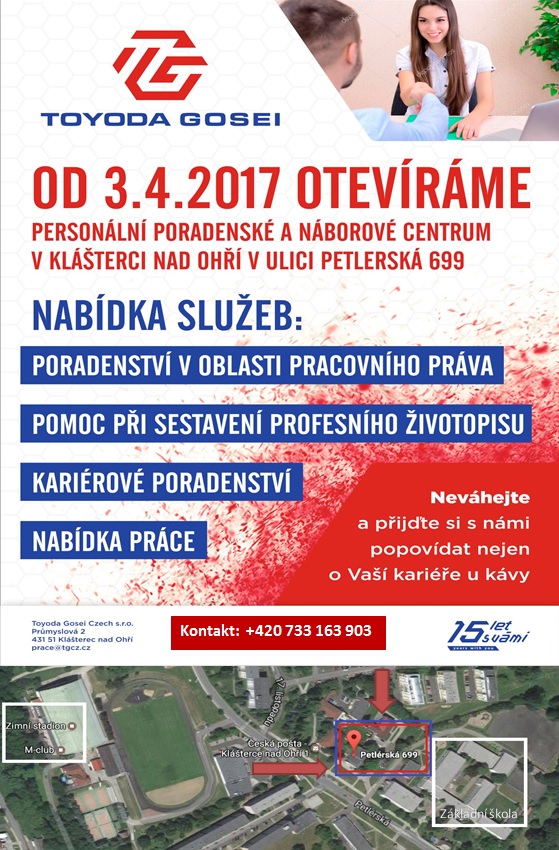 Přijďte navštívit nově otevřené náborové centrum v ulici Petlerská 699, Klášterec nad Ohří.Trápí Vás problematika pracovního práva? Neumíte správně sepsat životopis? Chcete být pečlivě připraveni na přijímací řízení nebo si ho jen vyzkoušet na nečisto? Nelíbí se Vám ve Vaší stávající práci a přemýšlíte o změně? JSME TU PRO VÁS!Každý všední den od pondělí do pátku 10:00 – 17:00 a také v sobotu 9:00 – 12:00. Kontakt: marcela.gunazerova@tgcz.cz, tel.: 733 163 903