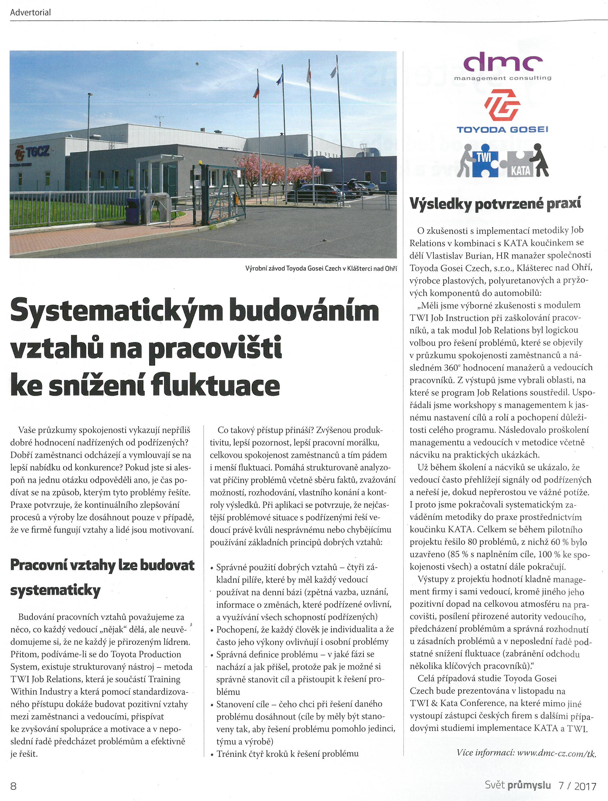 "Systematickým budováním vztahů na pracovišti ke snížení fluktuace", tak se jmenuje článek, který o nás publikoval časopis Svět průmyslu. Přečíst si jej můžete v příloze.